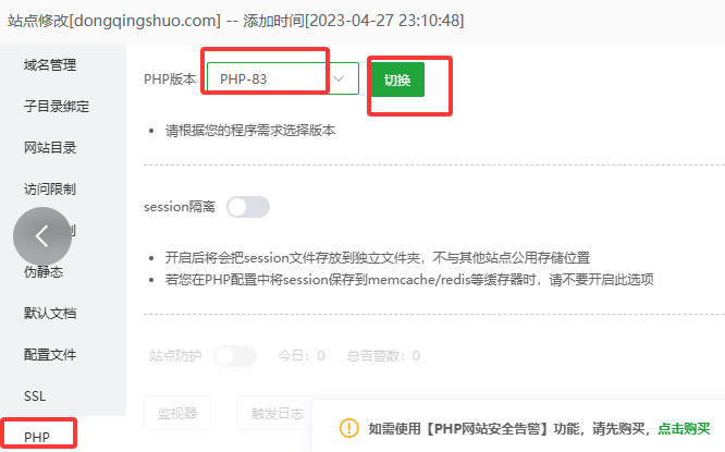 (以下补充说明,操作步骤,在宝塔后台左侧,找到网站,点击右边设置,找到PHP,看到PHP 版本,切换到PHP-83,点击切换可)